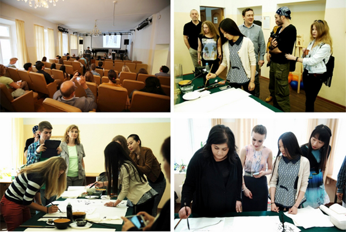 10日,公司王东声教授做了题为“中国书画艺术的黑白体系与造型逻辑”的学术讲座,受到莫大艺术系师生的极大关注。随后,举行了书画交流笔会,中国员工的现场演示激发了俄罗斯师生的极大兴趣,他们纷纷拿起毛笔尝试创作。