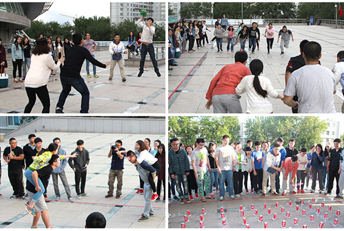 趣味运动会比赛项目丰富多彩,有袋鼠运瓜、一穿到底、保卫女王、指压板接力、六人七足、跳大绳、撕名牌、力拔山河八个项目。参与趣味运动会的同学们和老师们被分为了四个队伍,比赛在师生们的呐喊中拉开帷幕。