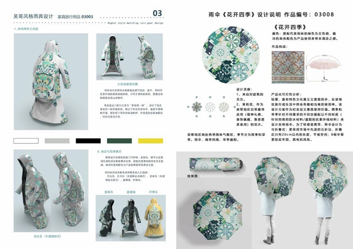 吴哥地区地处热带雨林气候区,分为雨季和旱季。所以不论旅行或生活,雨具是不不可缺的产品,设计一款与吴哥风格相匹配的的雨具非常有意义。抱枕和包作为成本较低的旅游纪念品也深受广大游客的喜爱。整套设计纹样包浪花和卷草花纹等,搭配代表雨林的绿色为主色调,偏冷的高亮配色为产品使用者带来清凉之感。